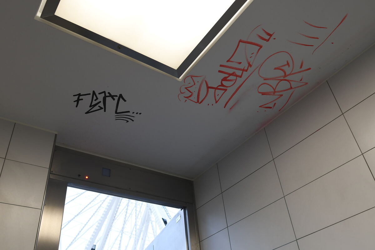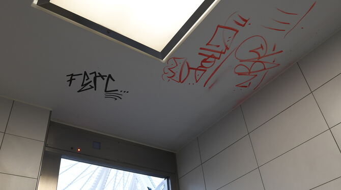Krasse Schmierereien an der Decke einer Toilette im Bürgerpark. Ihre Entfernung ist zeitaufwendig.