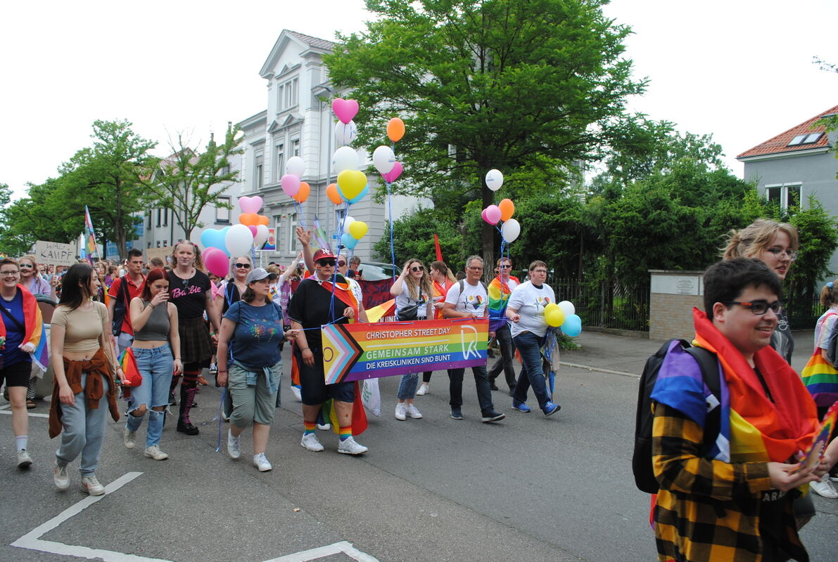 REUTLINGEN. Der Verein CSD Reutlingen hat am Samstag zum zweiten Christopher Street Day in der Achalmstadt eingeladen. Um für die Akzeptanz und Gleichberechtigung von homo-, bi- und transsexuellen, queeren sowie inter- und asexuellen Menschen zu demonstrieren, zogen am frühen Nachmittag rund 150 Menschen in einer schillernd-bunten Parade vom Busbahnhof durch die Reutlinger Straßen bis zum Bürgerpark. Knapp 1.000 Menschen zählten die Veranstalter bei der Kundgebung. Der CSD stand unter dem Motto »Liebe verbindet«, ein Thema, das in den Augen des Vorsitzenden Maximilian Berg aktueller denn je ist, nicht nur die »LGBTQIA+«-Community betreffend: »Wir müssen ganz klar Kante gegen Rechts zeigen!« Auch dafür stehe eine Pride-Veranstaltung. Rechtsextreme hätten queere Menschen schon immer unterdrückt. »Ich fürchte, dass diese Zustände in Deutschland zunehmen, wenn deren Wähleranzahl weiter steigt. Deshalb ist es total wichtig, dass wir die Menschlichkeit und die Liebe feiern, die wir alle irgendwie gegenseitig spüren.« (jen)