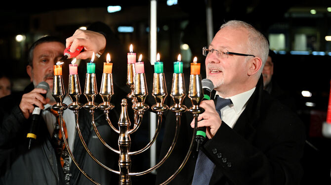 REUTLINGEN. Chanukka – jüdisches Fest der Wunder, des Lichts und der Hoffnung: Gefeiert wurde es gestern Abend zum zweiten Mal öffentlich auf dem Reutlinger Marktplatz. Deutlich über zweihundert Frauen, Männer und Kinder waren hier zusammengekommen, um den Segen von Rabbiner Mark Mordechai Pavlovsky zu empfangen, interreligiöse Gemeinschaft zu (er-)leben und menschgemachten Grausamkeiten wie Terror, Krieg und Verfolgung entgegenzutreten.