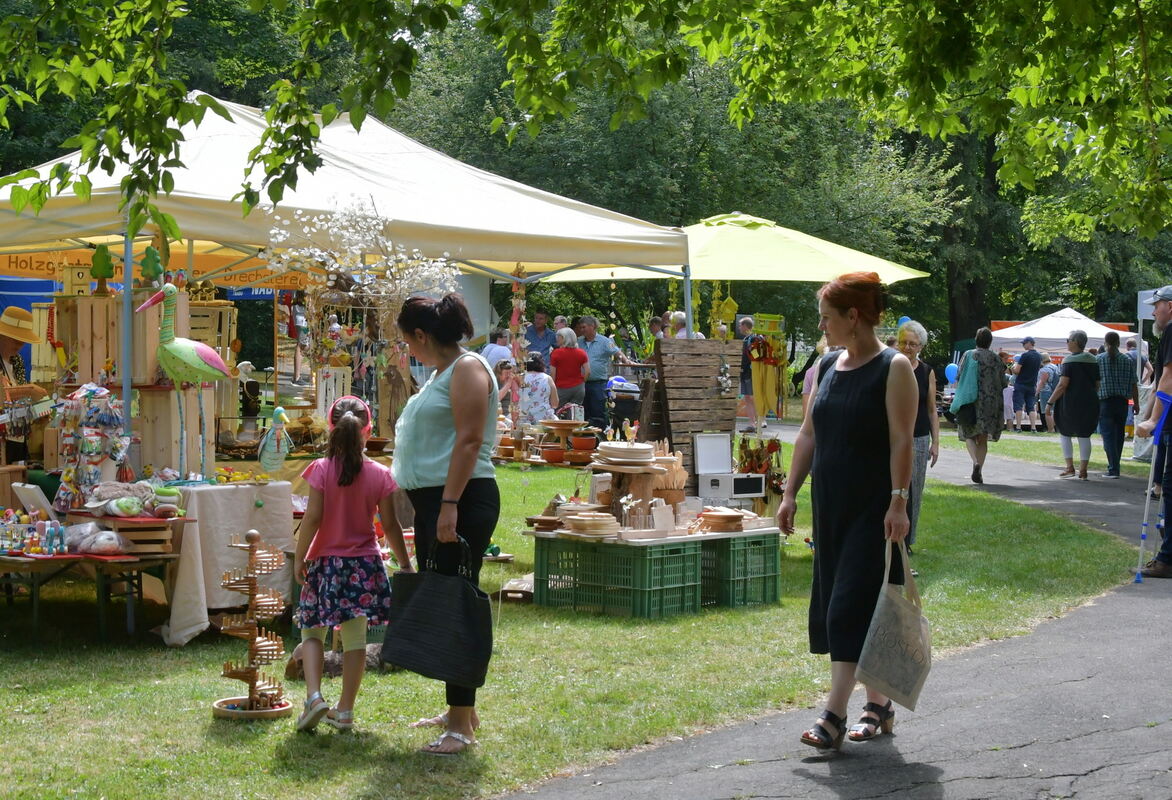 Unterm grünen Blätter-Baldachin des Stadtgartens: Ein Bild vom Neigschmeckt-Markt 2019.