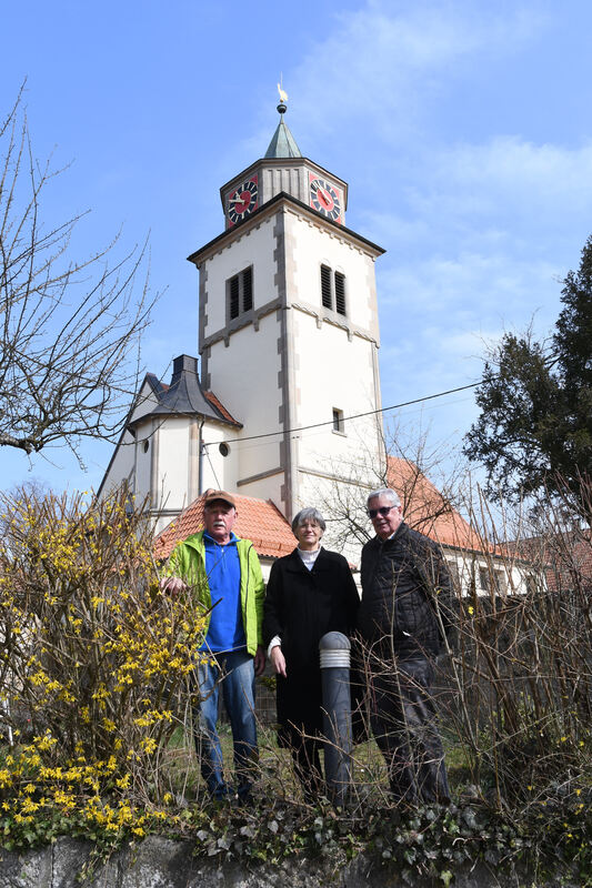 Das neue Dach der Martinskirche in Mittelstadt erfreut (von links) Kirchengemeinderat Otto Galster, der viel Zeit auf der Baustelle verbracht hat, sowie Pfarrerin Gerlinde Henrichsmeyer und Richard Föll, Vorsitzender des Kirchengemeinderates. FOTO: ZENKE