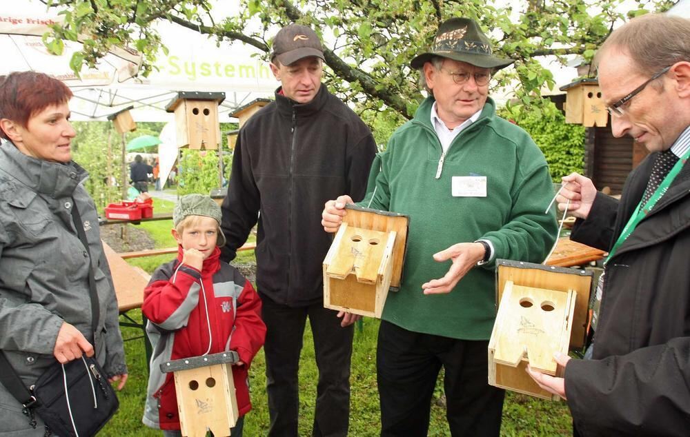Bodo Kablau vom Umweltbildungszentrum Listhof (zweiter von rechts) will bei der Garden Life im Reutlinger Volkspark möglichst viele Nistkästen unter die Leute bringen. Der Vorsitzende des Obst- und Gartenbauvereins Dietmar Bez (rechts) findet das Projekt gut.