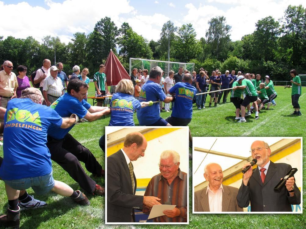 Viel Spaß hatten Zuschauer und Teilnehmer des Tauzieh-Wettkampfs in Sondelfingen. Feierlich wurde es bei der Ehrung verdienter TSV-Mitglieder durch die Offiziellen des WFV (kleine Bilder von links): Herbert Rösch und Werner Schnurnberger sowie Alfred Reinhardt und Horst Beck.