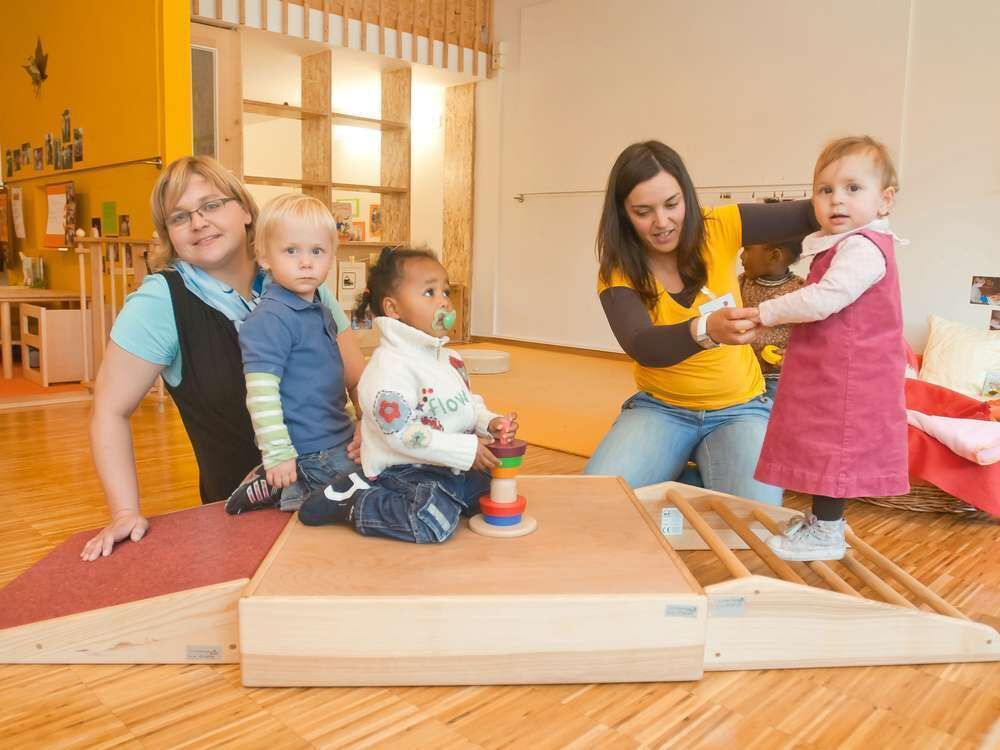 Luftig und hell sind die Räume der neuen Krippe im Kinderhaus Laura-Schradin-Weg - nicht nur zur Freude der kleinen Bewohner. Auch Kinderhaus-Leiterin Daniela Pilger (links) und die sozialpädagogische Fachfrau Nisa Santos fühlen sich hier sichtlich wohl.