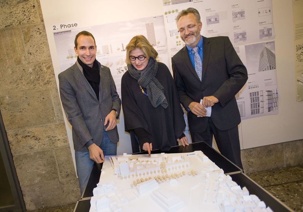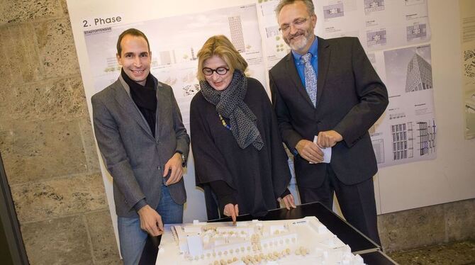 Der preisgekrönte Reutlinger Architekt Axel Walk, Baubürgermeisterin Ulrike Hotz und der geschäftsführende Gesellschafter der Blue Estate nehmen die Zukunft des Hamburg-Mannheimer-Areals (Modell) in Augenschein.