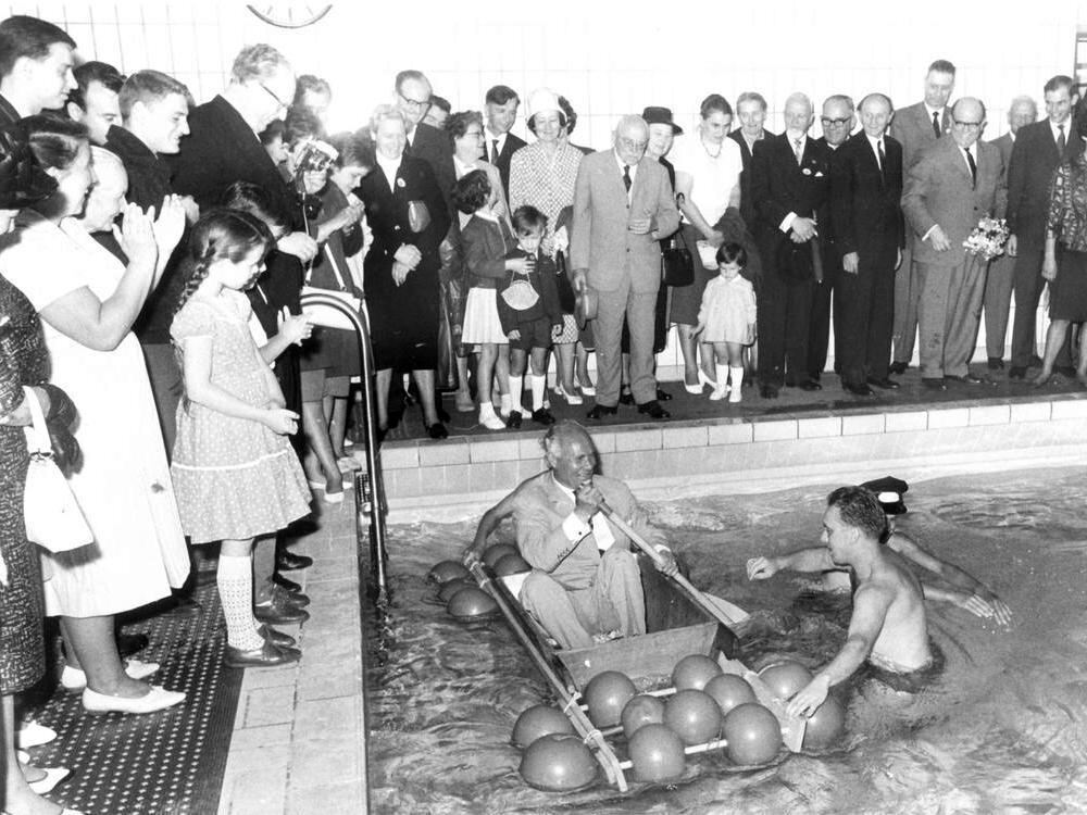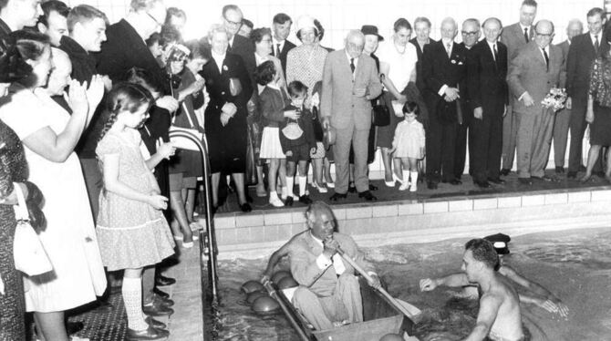 Nach dem Krieg 28 Jahre am Ruder: Oskar Kalbfell 1962 bei der Einweihung des Oberlin-Lehrschwimmbeckens. GEA-ARCHIVFOTO: DOHM
