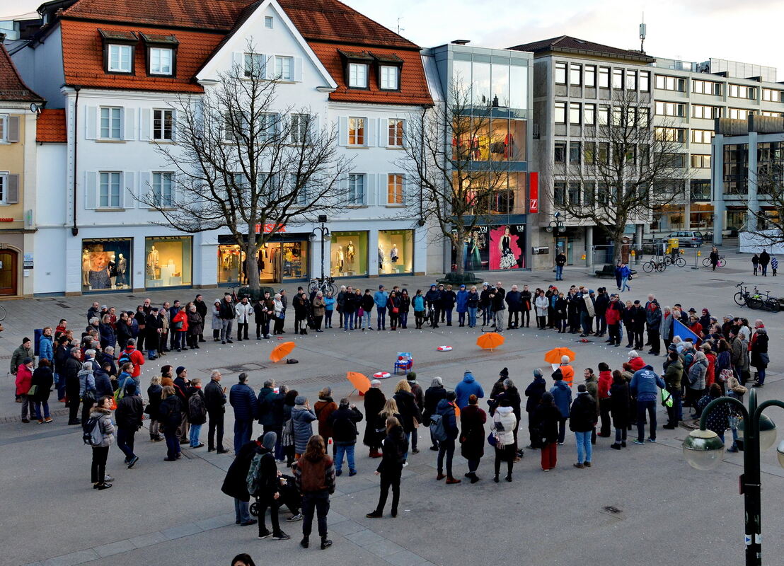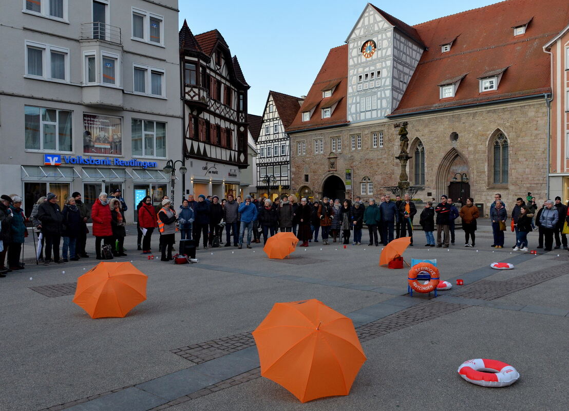 »Das einzige, was wir an der Grenze schützen müssen, sind Menschenrechte«, sagte Katharina Bausch von der Seebrücke - und bekam dafür spontanen Applaus. Sie prangerte in ihrer Rede Gewaltausbrüche und Ablehnung gegenüber Flüchtlingen an. Dann schwiegen alle, die sich auf dem Marktplatz versammelt hatten, eine Minute lang: Zum Gedenken an alle, die auf der Flucht und an den Grenzen ihr Leben verloren haben. (GEA)