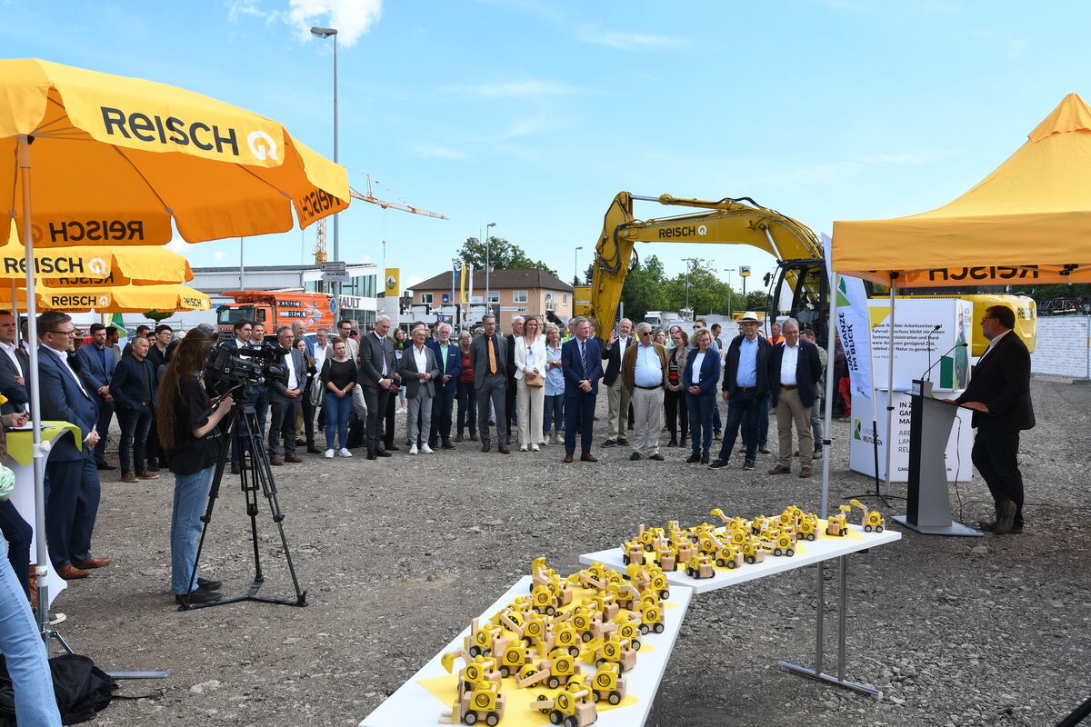 Vorne kleine Holzbagger als nettes Geschenk der Baufirma, hinten rechts Landrat Dr. Ulrich Fiedler und viel Prominenz beim Baggerbiss auf der Baustelle des neuen Reutlinger Landratsamtes. FOTO: ZENKE