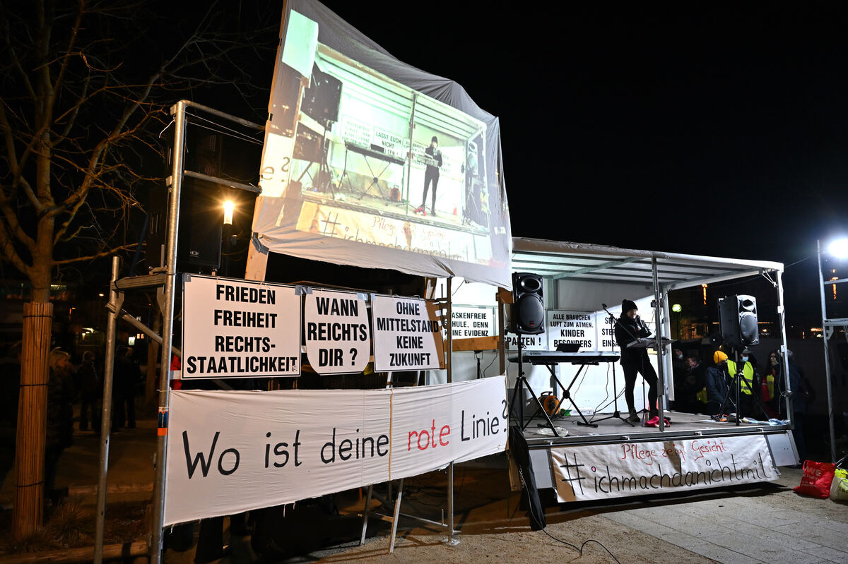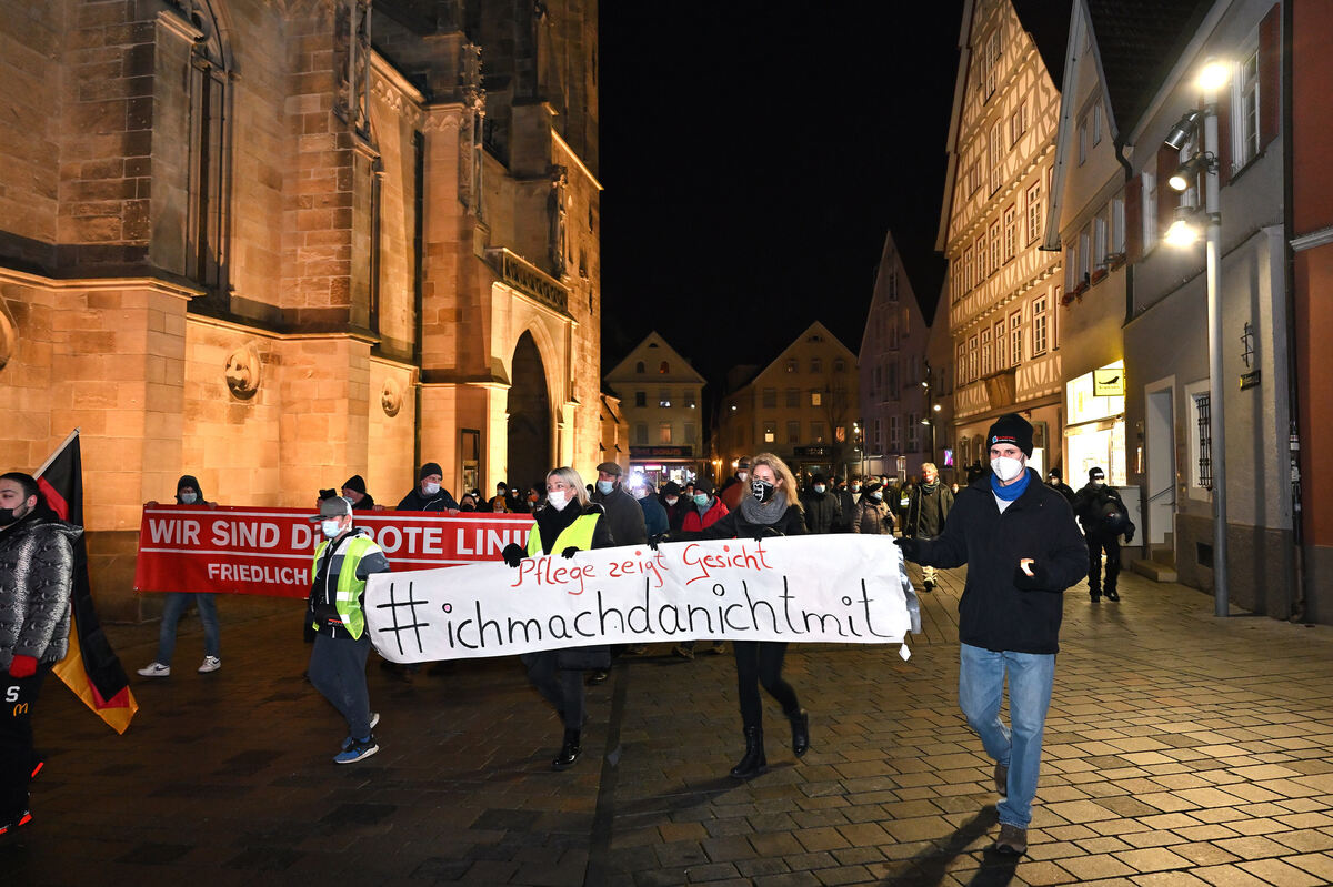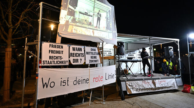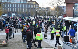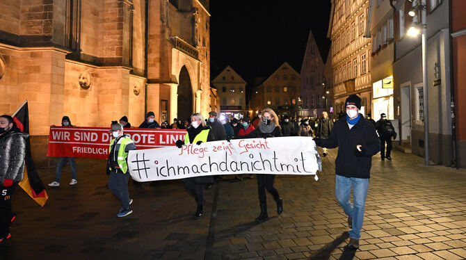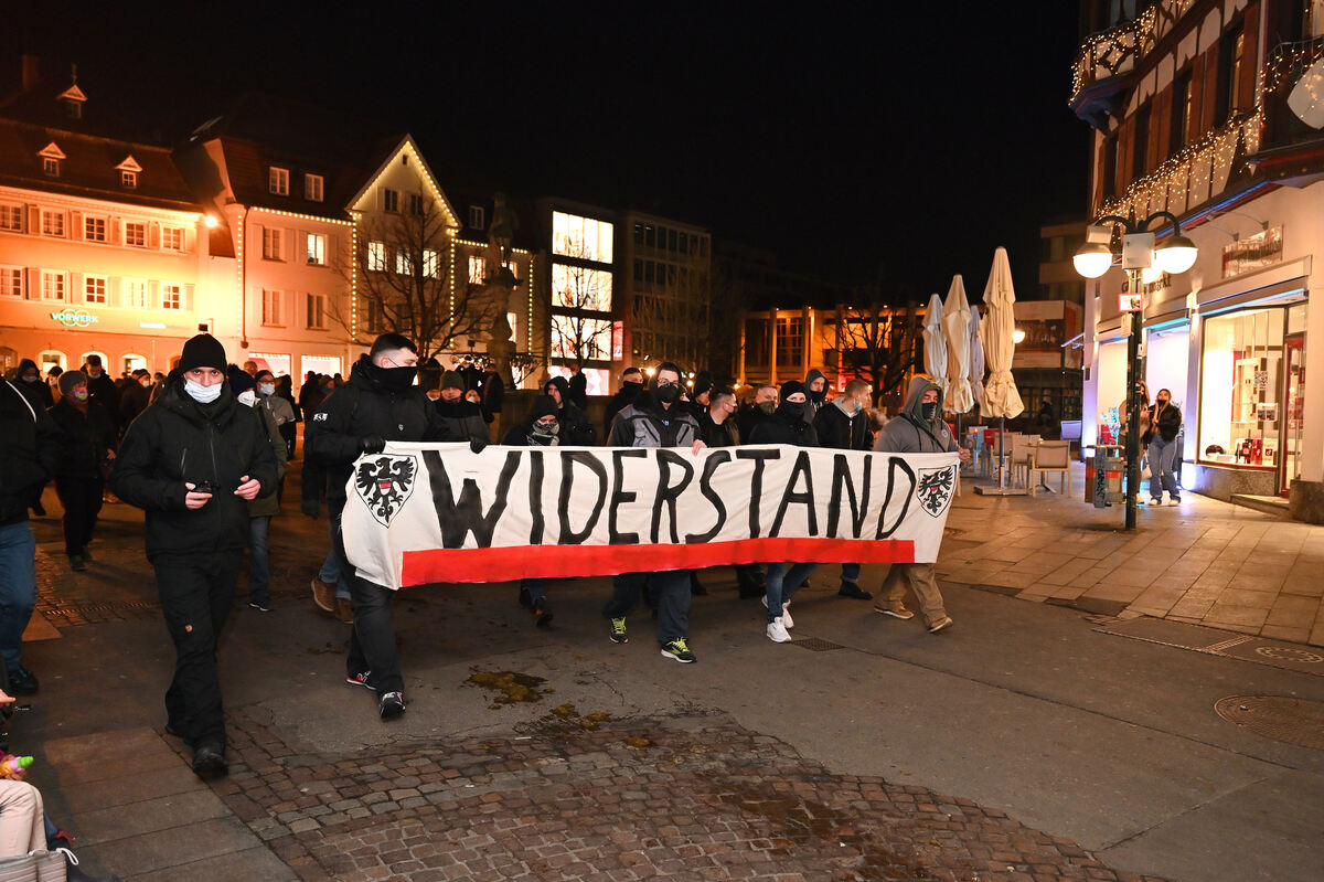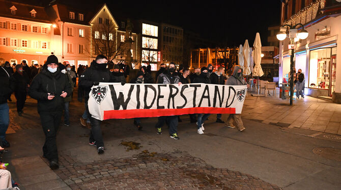 »Friede, Freiheit, keine Diktatur«, forderten Impfgegner unter dem Demonstranten, die zugleich zum »Widerstand« aufriefen: schwarz auf weiß geschrieben, rot unterstrichen sowie flankiert von zwei Reutlinger Stadtwappen trugen sie ein Banner in der Menge vor sich her.