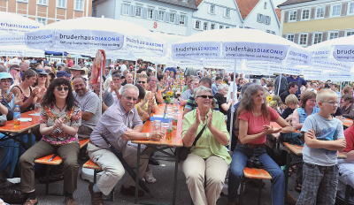 REUTLINGEN. Bierbänke, Tische, Bühne oder Kassenhäuschen bei Regen aufzubauen, ist kein Vergnügen - aber auch schnell wieder vergessen, wenn sich die dunklen Wolken dann doch verziehen. Am Samstagmorgen konnte damit allerdings niemand rechnen. Die Aussichten waren grau in grau und so mancher hatte die Befürchtung, dass der Auftakt zum Jubiläumsfestival anlässlich des 200. Geburtstages von Gustav Werner auf dem Reutlinger Marktplatz ins Wasser fallen könnte. Um so glücklicher waren die Mitarbeiter der Bruderhaus-Diakonie, als sich der Regen gegen Mittag verzog.