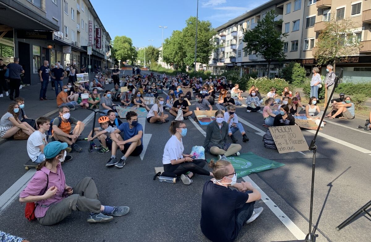 Etwa 100 Teilnehmer werden erwartet. Kurz vor 18 Uhr sind dann etwa 250 Personen anwesend. Die meisten kommen auf ihren Fahrrädern oder zu Fuß, viele von ihnen knien vor der Kundgebung auf der Grünfläche neben der Straße und bereiten die letzten Transparente vor, die schlussendlich in die Höhe gereckt werden. Mit Masken und wo es möglich ist auch mit dem nötigen Corona-bedingten Sicherheitsabstand, lässt sich die Menschenmenge schließlich auf der Karlstraße nieder. Jedoch nicht auf der ganzen Breite. »Den Fahrradweg bitte freimachen«, ruft Schneider in ein Mikrofon und ergänzt: »Wir mögen Fahrräder«. Um diesem Bekenntnis Ausdruck zu verleihen, gibt es für jeden Radler, der vorbeifährt tosenden Applaus und Laola. Manchen der ahnungslosen Vorbeifahrenden scheint jedoch nicht ganz klar zu sein, ob sie hier bejubelt oder veräppelt werden.