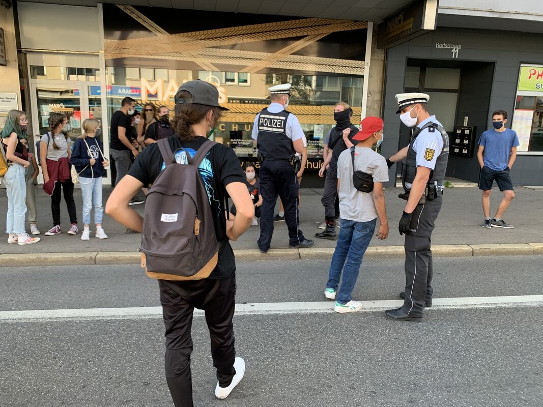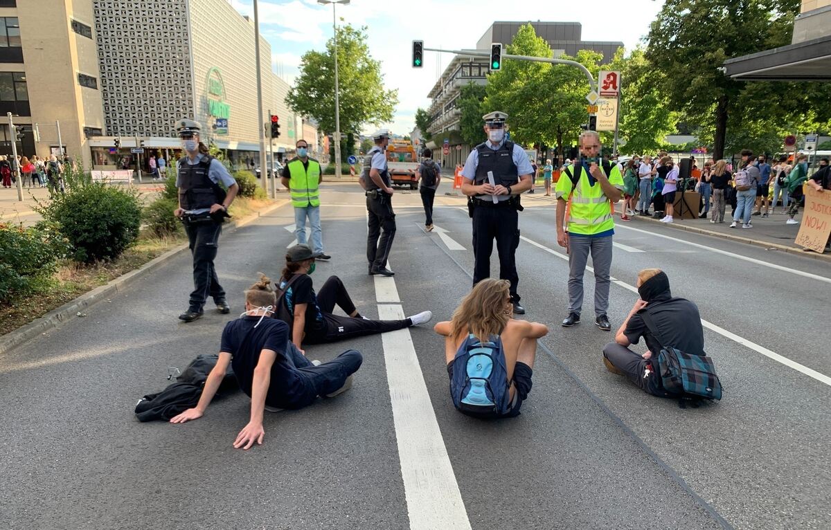 Um 18.36 ist die friedliche Kundgebung beendet, die Aktivisten verlassen die Straße. Sechs Personen bleiben jedoch sitzen, weigern sich den Anweisungen von Ordnungsamt und Polizei Folge zu leisten. Fast eine Viertelstunde lang, zeigen die Beamten eine Eselsgeduld und versuchen die Jungs zu überzeugen. Doch vergeblich. Schließlich streifen sich die Polizisten ihre Handschuhe über, bereit einen nach dem anderen von der Fahrbahn zu schleifen. Als die Jugendlichen merken, dass es ernst wird, verlassen sie schließlich die Karlstraße, der Verkehr kann wieder fließen.