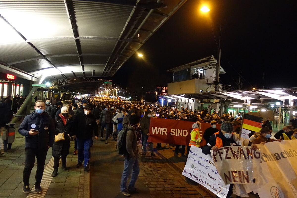 Waren es am 15. Januar 2.500 und am 22. Januar 3.800 Teilnehmer – laut Polizeiangaben 2.600 –, kamen vorgestern 4.500 zusammen, die zwischen 18 und 20 Uhr friedlich von der Eberhardstraße über den ZOB Richtung Karlstraße, in die Kaiserstraße und dann in die Schulstraße zogen, ehe es von der Charlottenstraße über Burgstraße und Burgplatz in die Wilhelmstraße und zurück zur Stadthalle ging.
