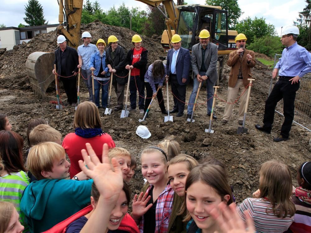Auftakt für den FES-Neubau (mit Spaten von links): Architekt und Projektplaner Jochen Schmid, Robert Theurer (Theurer Hoch- und Tiefbau GmbH Altensteig), Tanja Knecht (Elternbeiratsvorsitzende), Ingrid Schaar (Klassenlehrerin und Bauausschuss-Mitglied), Dominik Bölzle (Klasse 6c), Natalie Lorenz (Klasse 5a), Lothar Rein (Verwaltungsratsmitglied), Gebhard Quass (Geschäftsführer), Martin Kuhn (Rektor), Stefan Creuzberger (Konrektor Sekundarstufe 2).