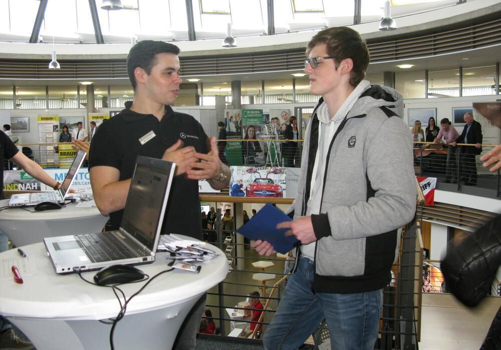 Marc Bauknecht, angehender Industriekaufmann bei Mercedes-Benz (links) erläutert Cedric Oeding, Schüler am Berufskolleg, worauf es bei der Ausbildung zum Industriekaufmann ankommt. 60 Betriebe stellen sich bei den IHK-Berufsinformationstagen vor. Interessierte Jugendliche können auch mit den Azubis direkt in Kontakt treten. FOTO: JAN HÖNESS