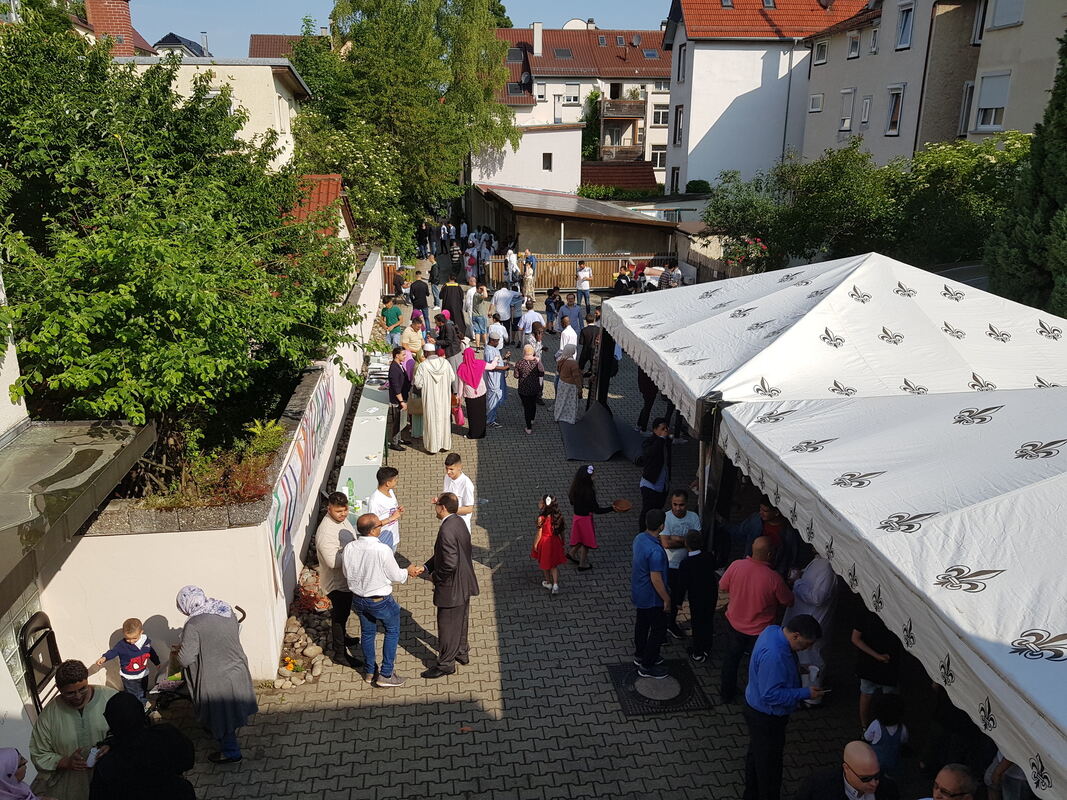 Da das Fastenbrechen und auch das alljährliche Opferfest traditionell im Freien gefeiert werde, haben die Mitglieder der Internationalen Islamischen Gemeinschaft den Hinterhof in der St. Leonhardstraße an diesem Morgen mit Teppichen bedeckt. In den vergangenen Jahren habe man das Fastenbrechen in der Eishalle gefeiert, sagt der 45-jährige Softwareentwickler El Kadi, der seit vergangenem Jahr Deutscher ist. Diesmal sei das nicht möglich gewesen.