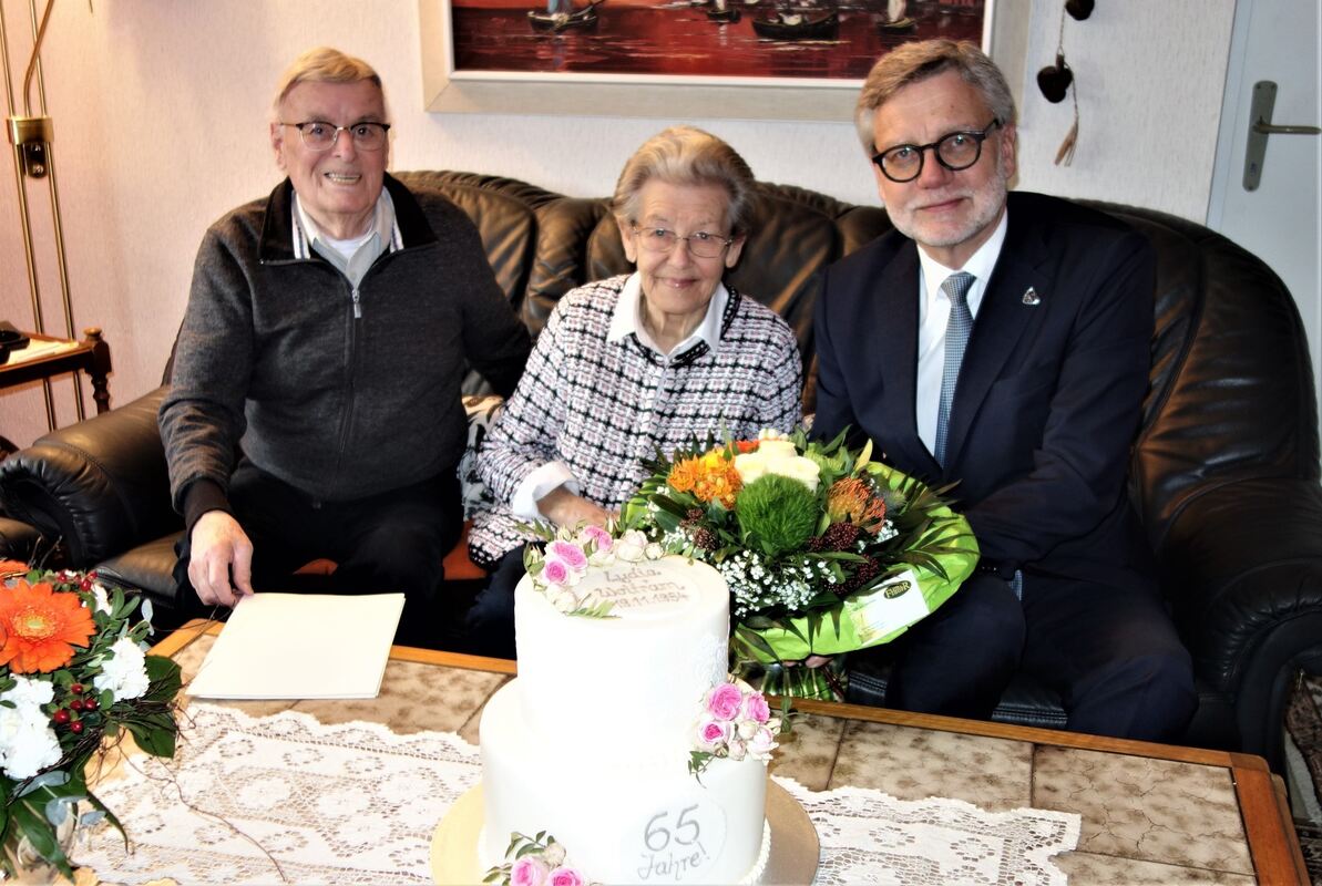 Bürgermeister Alexander Kreher (rechts) gratuliert dem Ehepaar Lydia und Wolfram Schmid zum Fest der eisernen Hochzeit. FOTO: BÖHM