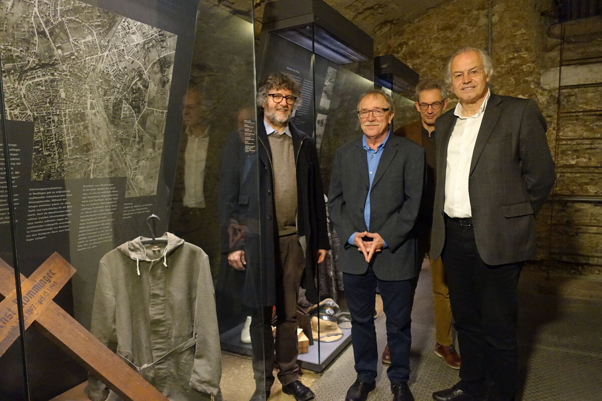 Martin Burgenmeister, Roland Wolf, Roland Deigendesch und Werner Ströbele (von links) präsentierten das Veranstaltungsprogramm. Das Foto entstand im Keller des Heimatmuseums, der im Zweiten Weltkrieg zum Luftschutzkeller umgebaut wurde. Die Spuren dieser Nutzung sind noch erhalten. Objekte dokumentieren die totalitäre Herrschaft des Nationalsozialismus, den Zweiten Weltkrieg und die unmittelbare Nachkriegszeit. FOTO: DÖRR