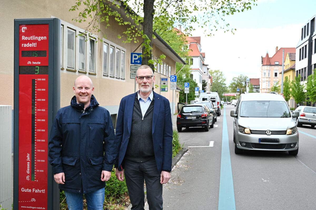 Schonfrist: Noch stehen Task-Force-Chef Philipp Riethmüller (links) und Ordnungsamtschef Albert Keppler entspannt daneben, wenn Geisterfahrer wie im Bild abgelichtet durch die Fahrradstraße rauschen. FOTO: PIETH