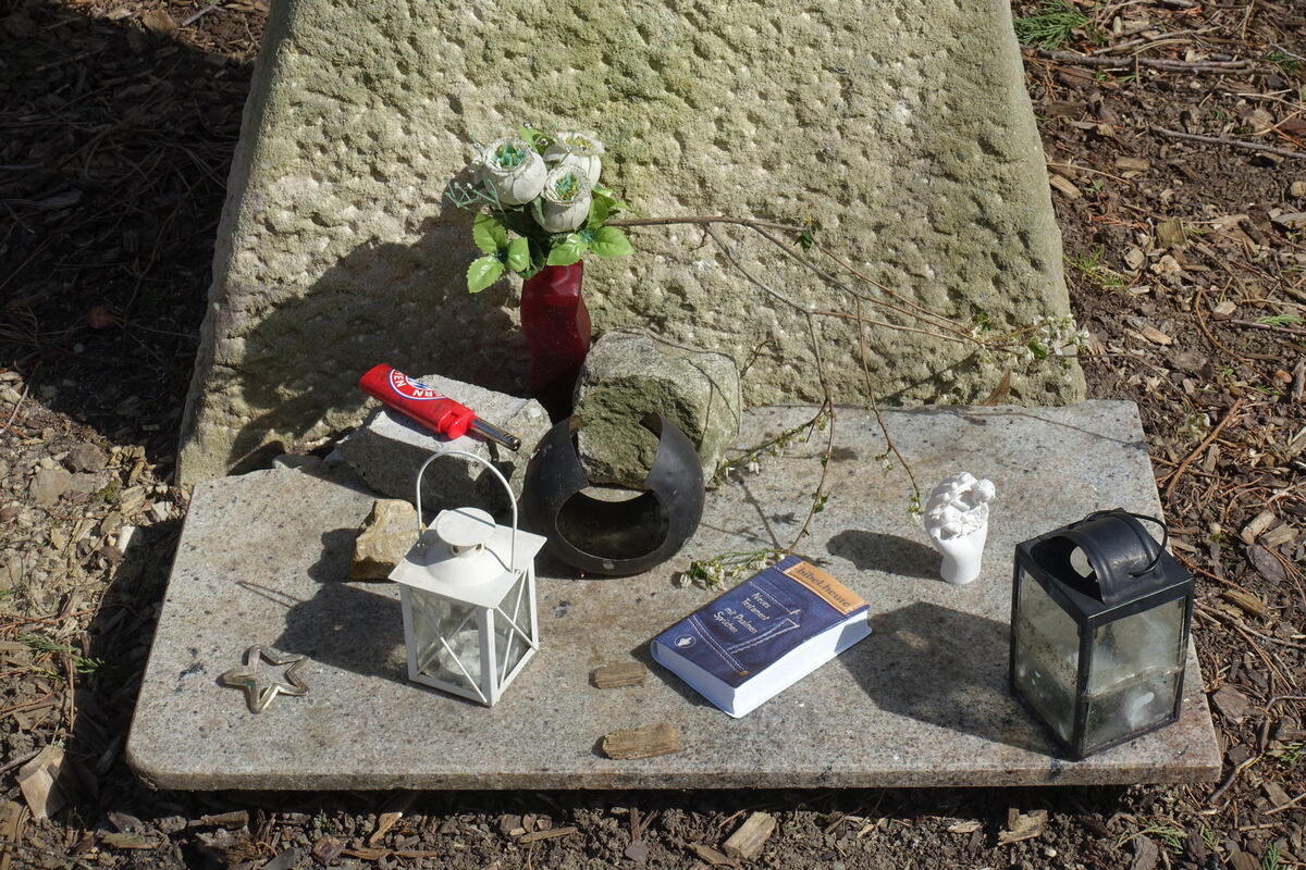 Der schöne Weg ist genau so. An der Kreuzung zur Burgstraße steht ein Wegekreuz, und verspricht göttlichen Beistand: »Ich bin da«. Davor haben gläubige Menschen auf dem Boden einige Kleinigkeiten hinterlassen. Nicht nur zwei Laternen, sondern gleich auch noch ein Fan-Feuerzeug des 1. FC Bayern zum Anzünden der Kerzen sowie eine Taschenbibel falls jemand Gottes Wort lesen möchte.