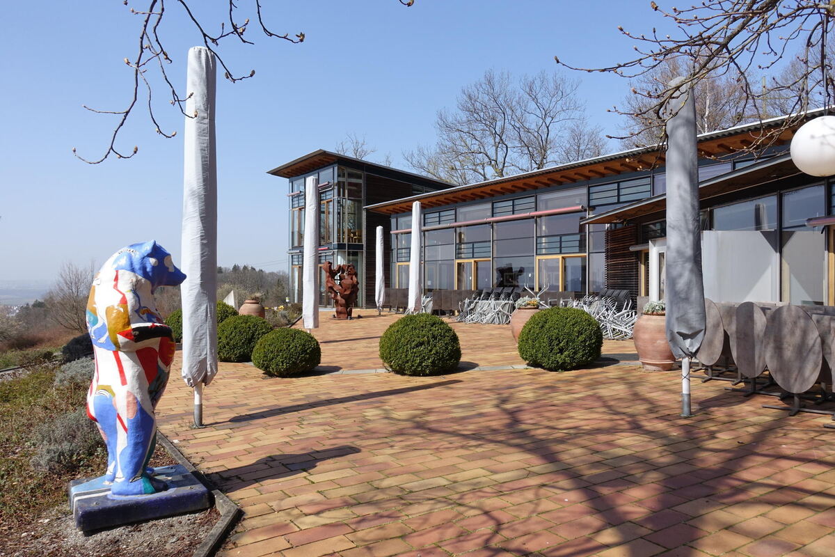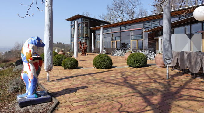 Es geht vorbei an Gütles mit Holzhütten, die liebevoll gebaut und gepflegt entzückend aussehen. Nach wenigen steilen Schritten kommt dann erstmals der allgemeine Stillstand ins Bewußtsein. Wie traurig, das elegante Hotel Achalm ohne Gäste vor sich auftauchen zu sehen. Nur die Bienen in einigen Stöcken auf der Wiese davor arbeiten emsig wie immer. An der Glastüre des Hotels hängt ein Zettel mit Worten, die aktuell vielerorts lesbar sind: »Liebe Gäste, aufgrund der aktuellen Verordnung des Landes Baden-Württemberg vom 20.3.2020 haben wir bis auf weiteres geschlossen... Auf bald bei uns auf der Achalm. Ihre Familie Dollinger«. Oh ja, was sich die Dollingers wünschen, spricht jedem aus dem Herzen. Denn an normalen Sonnentagen wäre auch die Terrasse des Achalm Restaurants der Platz schlechthin.