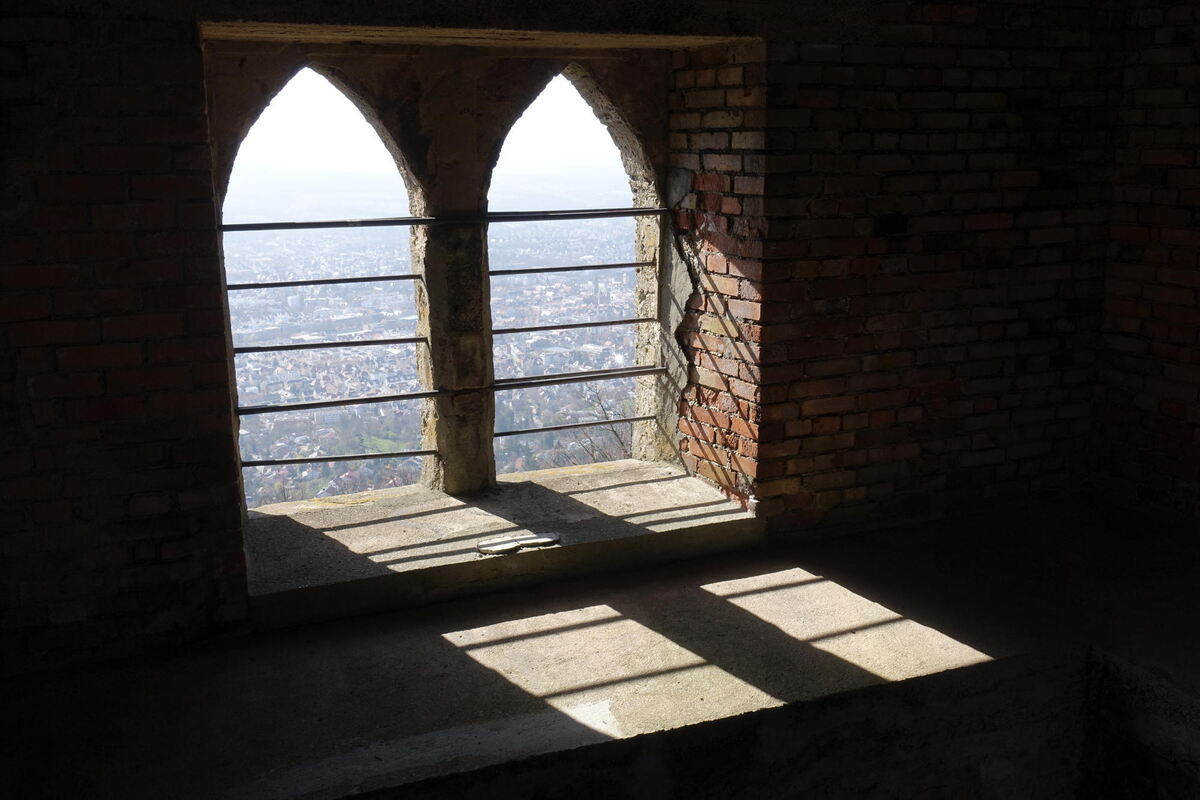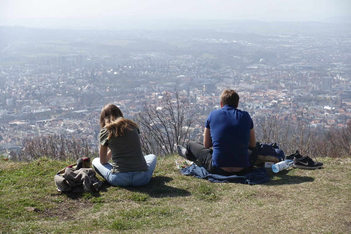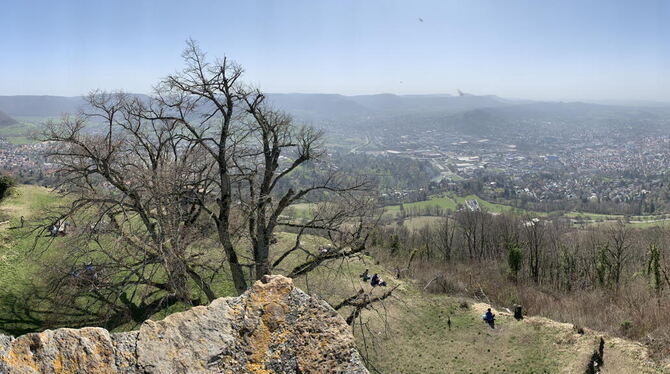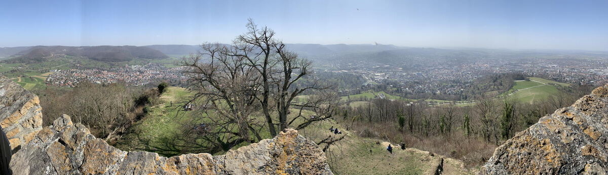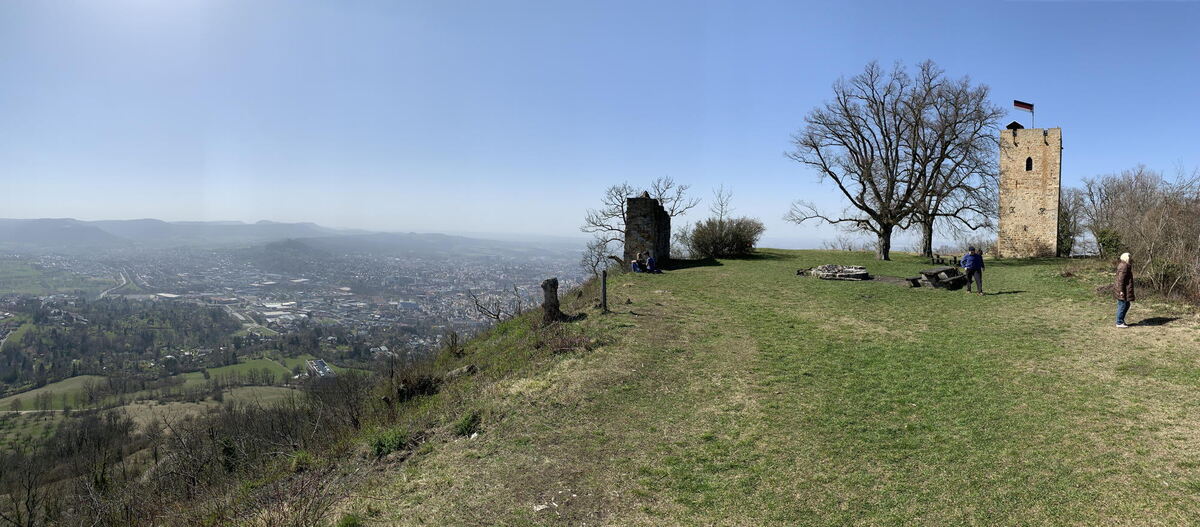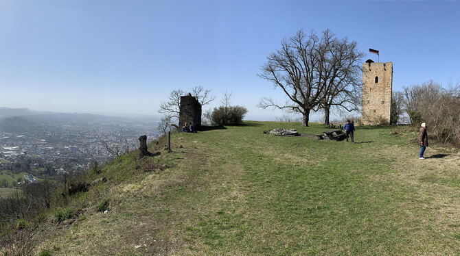 Weitergehen, hilft ja alles nichts. Ab hier führen viele Routen zum Gipfel. Entweder hart und steil ganz direkt, oder sanft gewunden in Serpentinen. In jedem Fall breit genug, um niemandem zu nahe zu kommen. Auch oben rund um den 1838 auf Wunsch von König Wilhelm I. auf den Grundmauern des Bergfrieds gebauten Turm der im 11. Jahrhundert entstandenen Burg der Grafen Egino und Rudolf ist mehr als genügend Platz um hübsch distanziert voneinander Platz zu nehmen. Wie diese Burg mal ausgesehen hat, lässt sich in einer Animation der Stadt Reutlingen nachvollziehen. Denn hier oben ist nicht nur das Panorama ausgezeichnet, sondern auch das Mobilfunknetz.