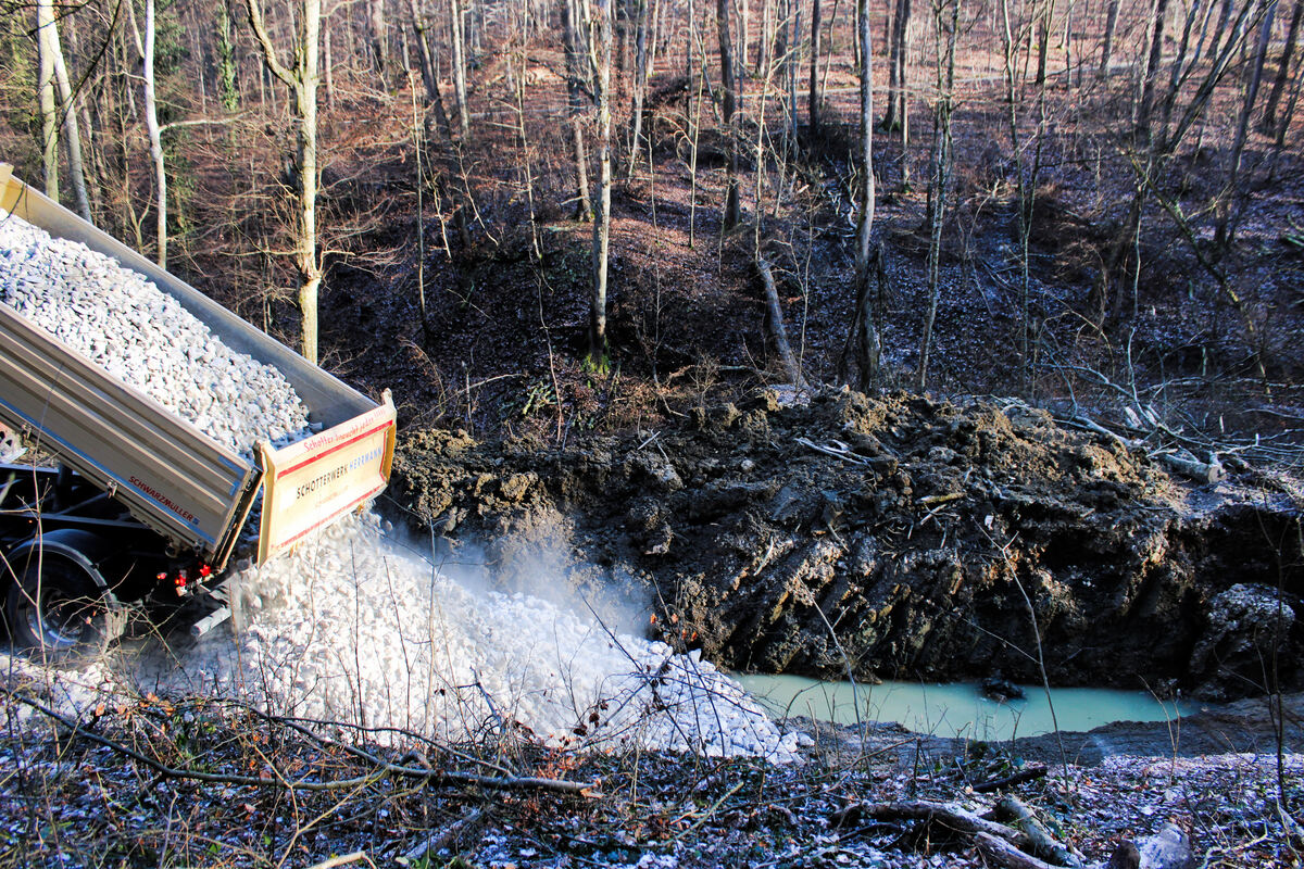 Eine Schotterladung nach der anderen verschwindet in der Vertiefung.