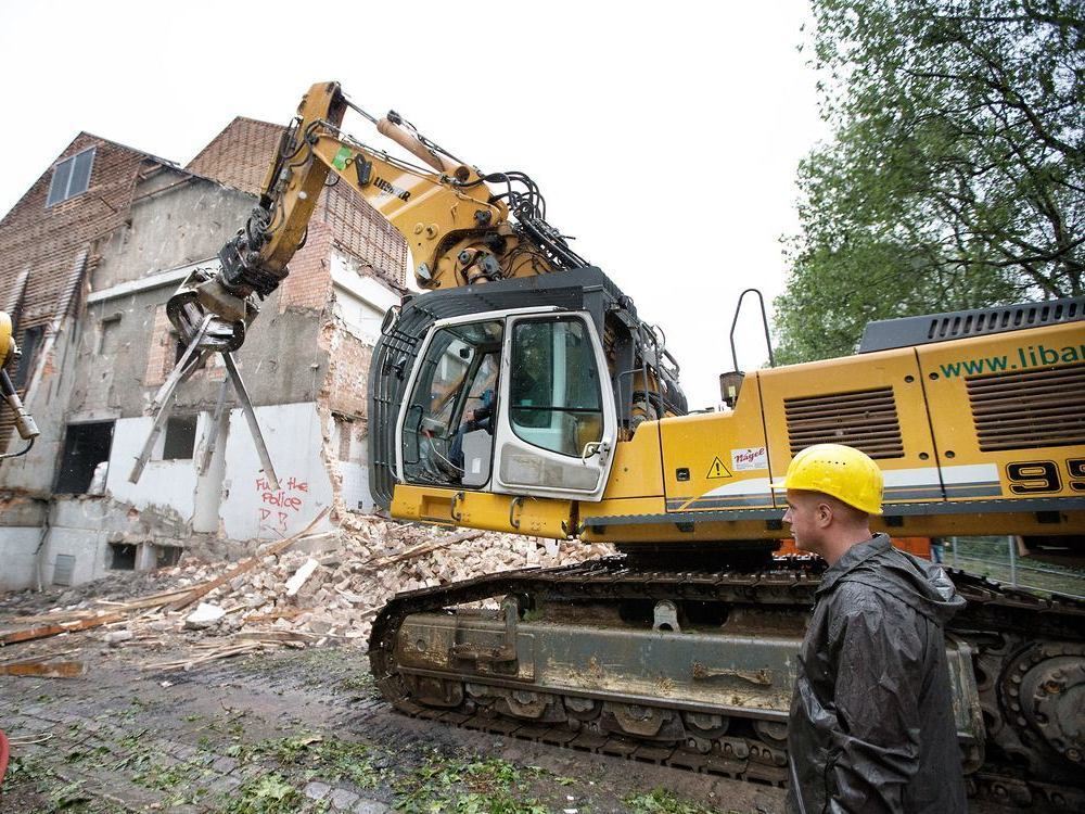 Mit voller Wucht beißt der Bagger zu – bis Ende der Sommerferien soll die Listhalle dem Erdboden gleichgemacht sein.