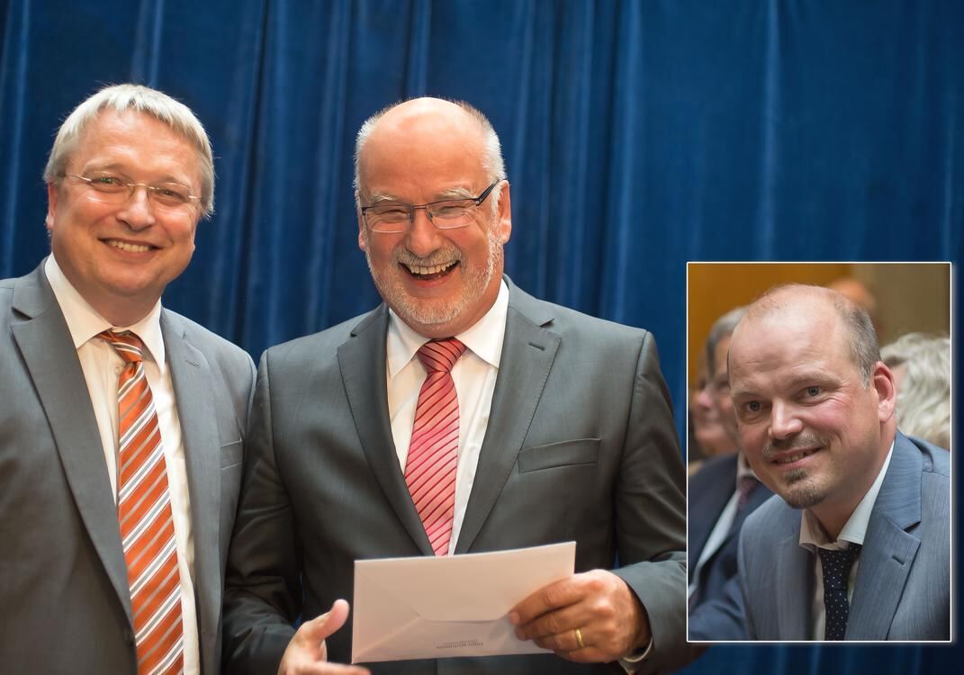 Bernhard Haas (Bildmitte), eingerahmt von einem gut gelaunten Kulturbürgermeister Robert Hahn (links) und seinem Nachfolger Dr. Günter Ernst.