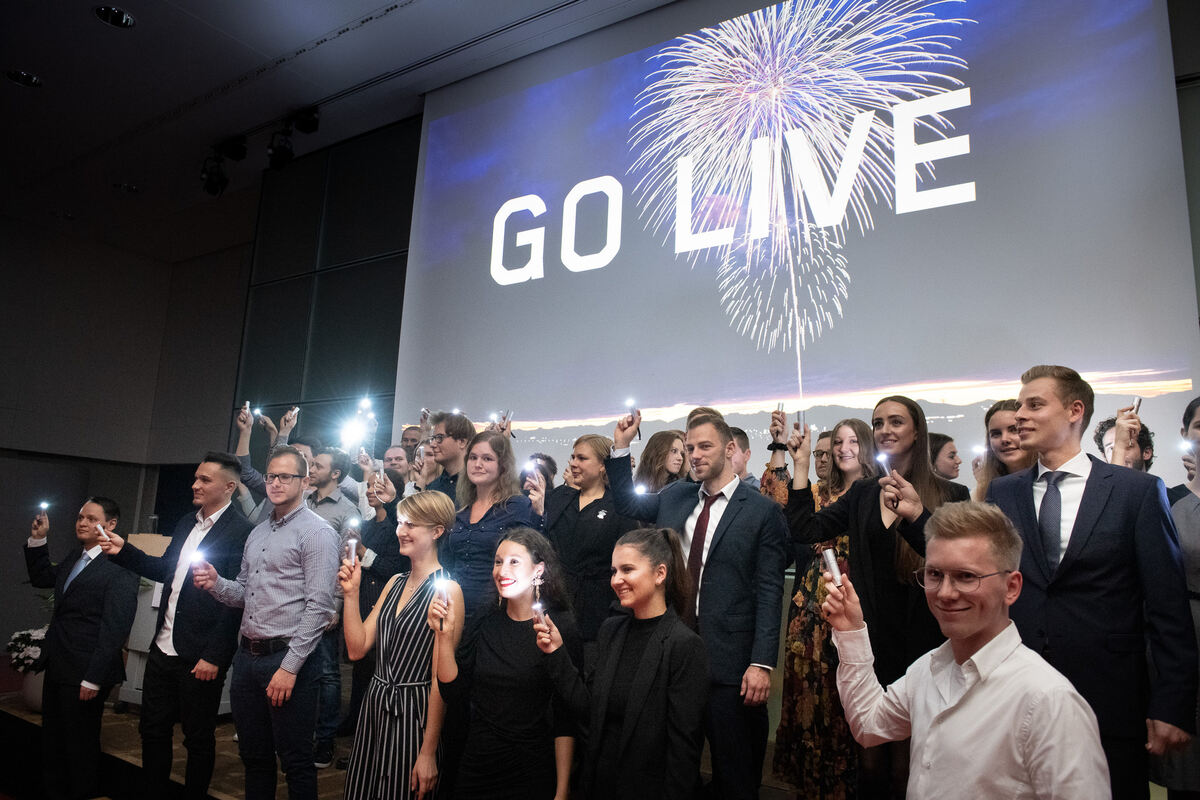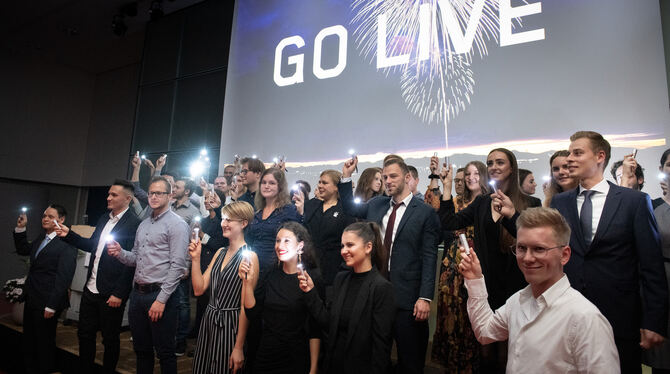 Leuchtend in den neuen Lebensabschnitt: Absolventen der Hochschule setzten sich und die Aula ins rechte Licht. Foto: Hochschule