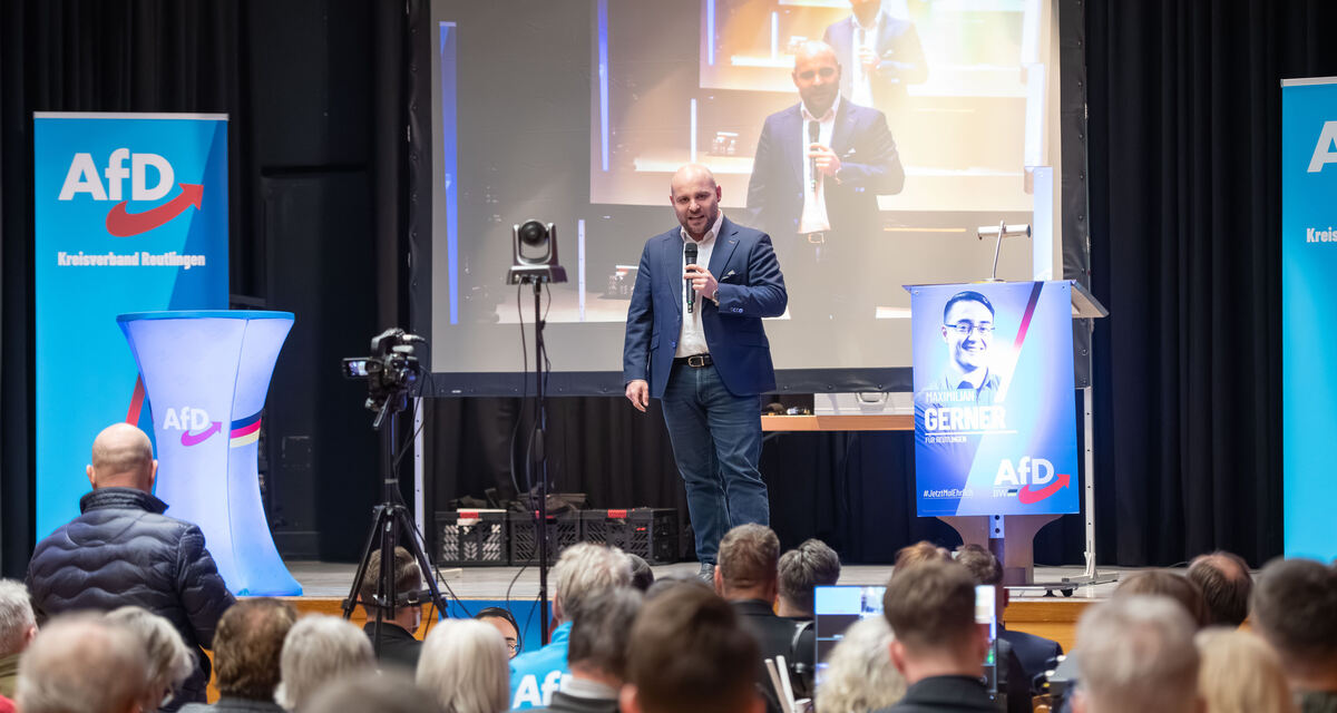 AfD-Spitzenkandidat Markus Frohnmaier in der Betzinger Julius-Kemmler-Halle.