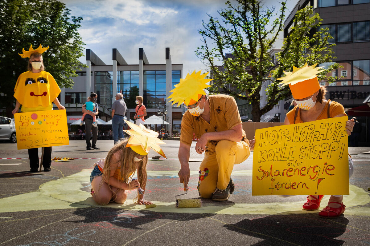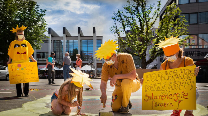 Ihr Ziel: Mehr Photovoltaik auf den Dächern. Und wenn Häuslebesitzer das nicht freiwillig machten, dann eben auf Zwang der Stadt – es gehe immerhin um das Klima. Mit »Sonnenhüten«, Plakaten für Solar- und gegen Kohleenergie, Positionspapieren und viel gelber Kreide unterstrichen die Reutlinger Klimaschützer ihr Anliegen. Das zu erfüllen, sei jedoch gar nicht so einfach, warf im Pressegespräch Reutlingens Klimaschutzmanager Ralf Bültge-Bohla ein: »Unser Baugesetz gibt die Verpflichtung von Privatpersonen zu Photovoltaikanlagen leider nicht her«, sagte er. Wegen der Statik seien auch nicht alle Dächer der kommunalen Gebäude kompatibel für die Solarmodule. »Wir haben aber dennoch schon viel in Richtung Solar getan«, zog er am Ende ein Fazit. »Es wird noch zu wenig getan« hieß es von Seiten der Aktivisten abschließend. (GEA)