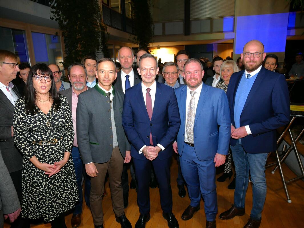 Beim Neujahrsempfang der FDP im Reutlinger Dominohaus gruppierten sich in der ersten Reihe neben Gastredner Volker Wissing (Mitte). Links davon Regine Vohrer und Pascal Kober, zur Rechten Andreas Glück und Florian Bauer. FOTO: LEISTER