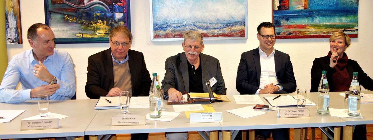 OB-Kandidaten diskutieren im S-Haus über die Vorzüge des Ehrenamts (von links): Dr. Christian Schneider, Thomas Keck, Moderator Christoph Kullmann, Dr. Carl Gustav Kalbfell und Cindy Holmberg. FOTO: BÖHM