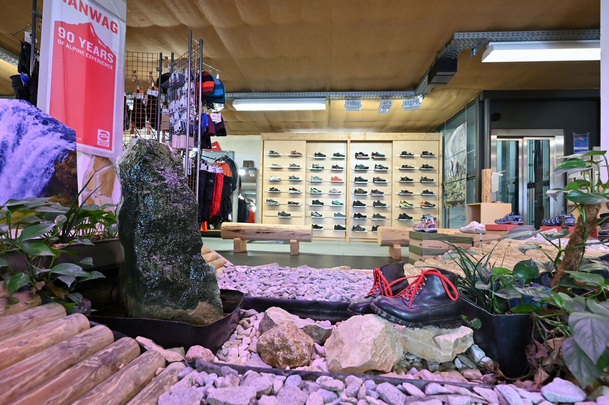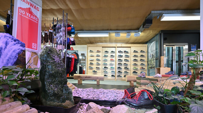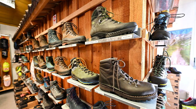 Auch das richtige Paar Wanderschuhe zu finden ist meist keine Angelegenheit von fünf Minuten. »Das sind Entscheidungen, die wohlüberlegt sein sollten. Die nötige Zeit dazu nehmen wir uns immer gerne und unterstützen, wo es nur geht« erklärt Karen Helliwell. Es mache einen großen Unterschied, ob man im alpinen Hochgebirge unterwegs ist, oder auf einem Wald- und Wiesenweg auf der Schwäbischen Alb, erklärt sie. Auf der hauseigenen Schuhteststrecke im Tramper-Haus lassen sich unterschiedliche Untergründe ausprobieren. Auf naturnah grobem, losem Gestein und mit Gefälle.