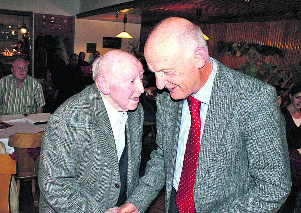 Der Ehrenvorsitzende des TSV Betzingen Dr. Otto Binder (rechts), der bei der Hauptversammlung für 60 Jahre Treue zum Verein geehrt wurde, gratuliert seinem Sportlerkollegen Ernst Göhring: Er ist seit rekordverdächtigen 80 Jahren Mitglied im TSV.