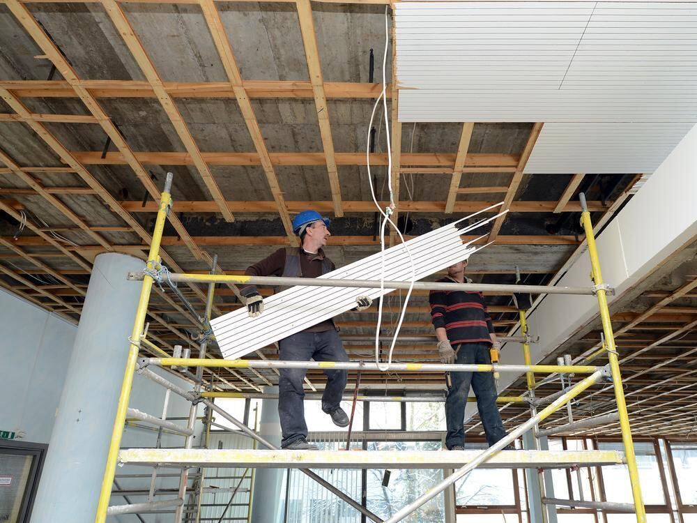 Die Paneele mit den Absorber-Vliesen sollen im Gebäude am Oskar-Kalbfell-Platz genutzt werden. Peter Geier zeigte eine der belasteten Spanplatten.