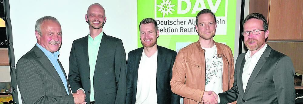 Alte Garde und frisches Blut beim Deutschen Alpenverein Sektion Reutlingen (von links): Ehrenvorsitzender Helmut Kober und Nachfolger als erster Vorsitzender Jochen Ammann, Jugendreferent Michael Büttgen und Schatzmeister Julian Johannsen mit seinem Vorgänger Peter Langenbucher. FOTO: HÄRING