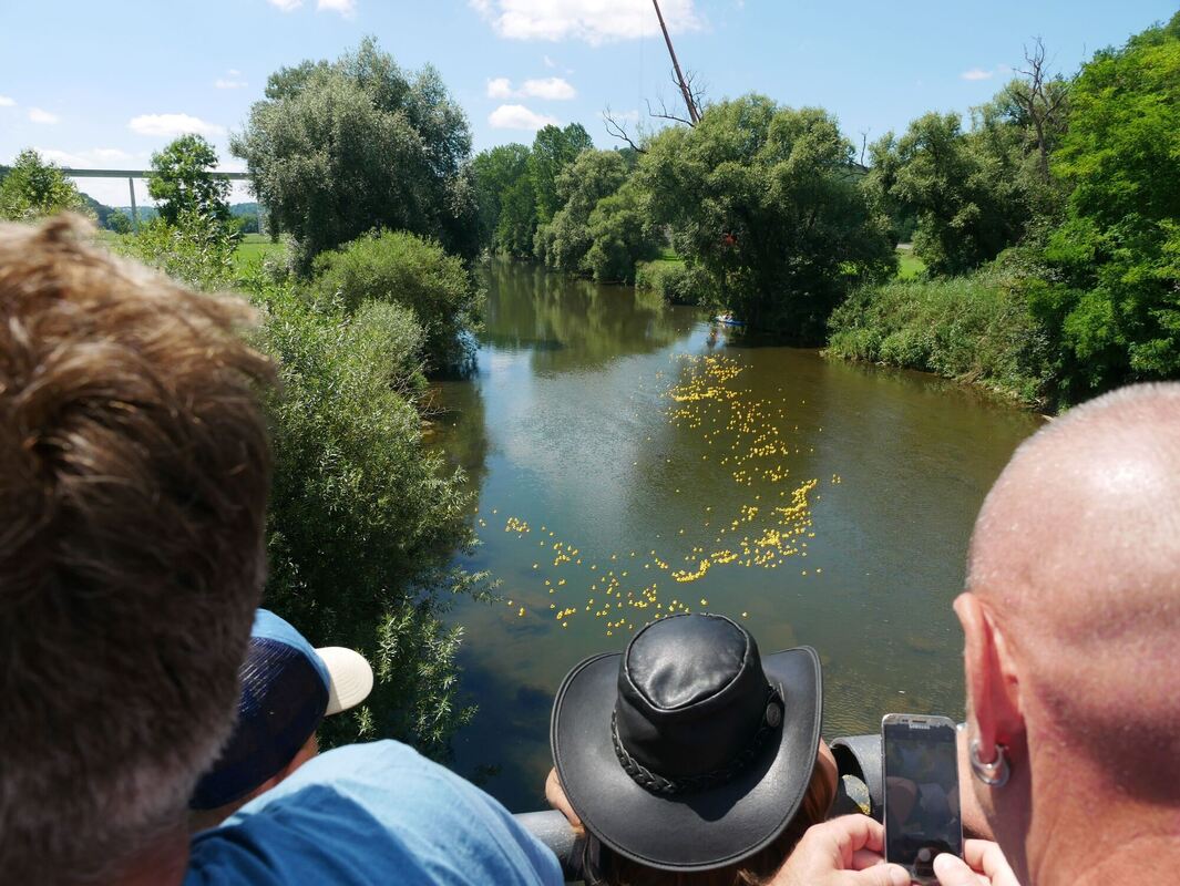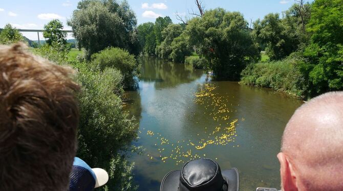 Auf die Plätze, fertig – und los geht das Enten-Spektakel auf dem Neckar.
