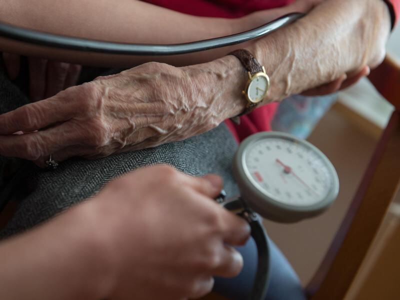 Eine Bewohnerin einer Seniorenwohnanlage bekommt den Blutdruck gemessen. Foto: Marijan Murat/Illustration