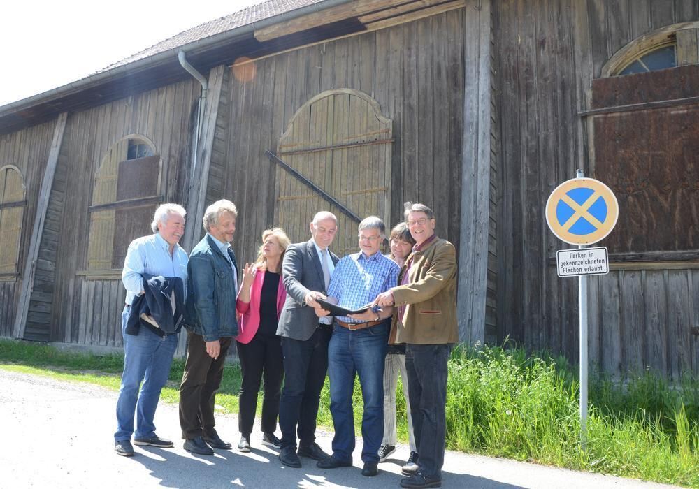 Die Fenster der Reithalle in der Hauffstraße sind zugenagelt. Ortsbegehung der Freien Wähler (von links)Erich Fritz, Kurt Gugel, Friedel Kehrer-Schreiber, Georg Leitenberger, Wilfried Müller, Annette Leininger und Jürgen Fuchs.