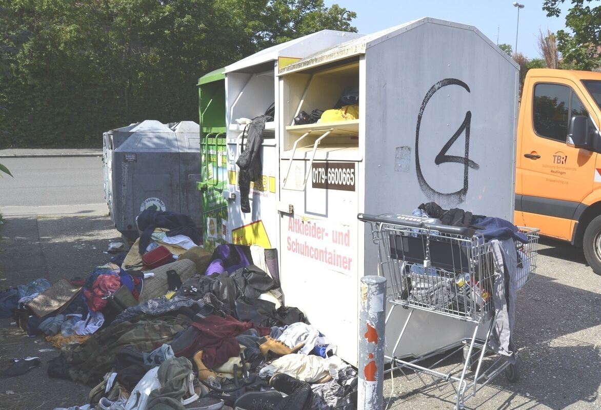 Nicht nur die Altkleidercontainer am Reutlinger Festplatz Bösmannsäcker quellen über. Achtlos weggeworfene Kleidungsstücke werden so zum Restmüll und Ärgernis.