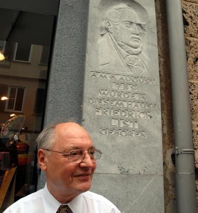 Dr. Eugen Wendler vor der Gedenkinschrift für Friedrich List an seinem Geburtshaus in der Wilhelmstraße, das heute die Buchhandlung Osiander beherbergt.