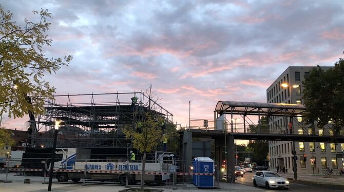 REUTLINGEN. Am frühen Donnerstagmorgen hat vor der Reutlinger Stadthalle der Rückbau des 42 Jahre alten Fußgängerstegs über der vierspurige Konrad-Adenauer-Straße begonnen. Ein Team von 14 starken Männern begann noch in der Dunkelheit damit, das Gerüst an der Nordseite des Steges zu demontieren, das im Jahr 2012 als eine Art Provisorium errichtet worden war. Über Rampenelemente und Treppen konnten die Fußgänger von der Stadthallenseite den Fußgängerüberweg erreichen. Den ganzen Tag haben die Gerüstbauer für den Abbau eingeplant.
