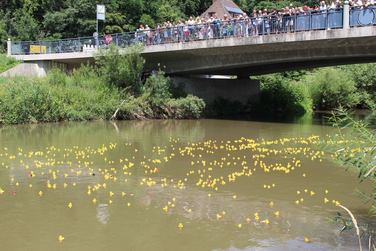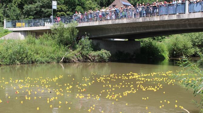 REUTLINGEN-ALTENBURG. »Es ist jedes Mal ein großes Spektakel«, freut sich Altenburgs Bezirksbürgermeister Frank Hofacker auf das Entenrennen am 7. Juli. Um 14 Uhr werden sich mehr als 1000 Enten auf den Weg neckarabwärts machen: Start ist an der Neckarbrücke, wo die Tiere in einer Gitterbox von einem Autokran nach oben gezogen und dann zu Wasser gelassen werden. Etwa 300 Meter weiter werden Mitglieder der Feuerwehr sie dann aus dem Wasser fischen - die Besitzer der schnellsten Tiere dürfen sich über Preise freuen. Seit rund zwei Wochen läuft der Vorverkauf der Enten bereits, erzählt Thomas Bader, Vorsitzender des Altenburger Gewerbevereins, der das Ganze organisiert, aber auch am Renntag selber wird noch Gelegenheit sein, eines der quietschgelben Wassertiere zu erstehen. Der Erlös wird gespendet.