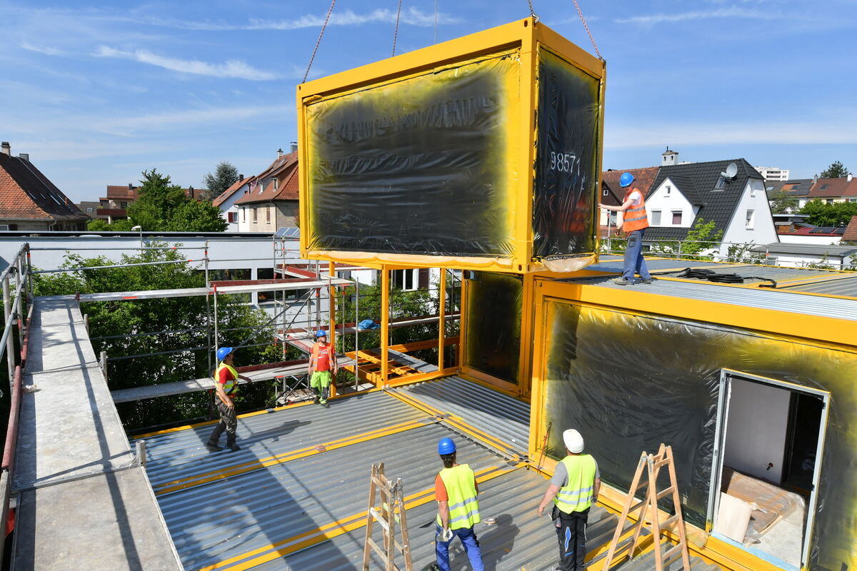 Klassenzimmer aus der Luft: Die Container für die Peter-Rosegger-Schule wurden gestern angeliefert. FOTO: MEYER