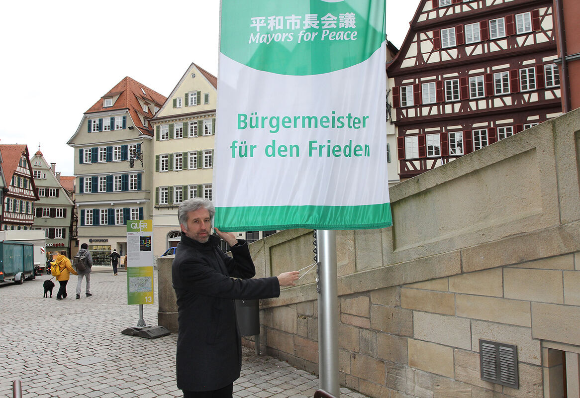 Als Zeichen der Solidarität mit den Menschen in der Ukraine beteiligt sich Tübingen an der Aktion des Bündnisses »Mayors for Peace« (Bürgermeister für den Frieden). Oberbürgermeister Boris Palmer hat am Freitag die Flagge des Bündnisses auf dem Marktplatz gehisst.