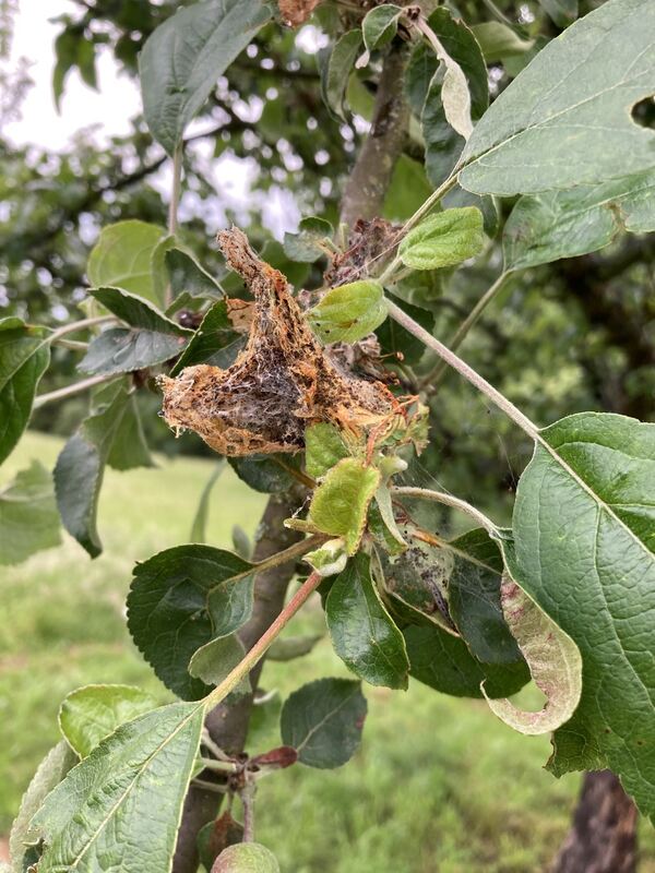 Um diese Zeit im Jahr sind die Raupen bereits über einen Zentimeter groß. Von einem feinen Gespinst geschützt, fressen sie nun ganze Blätter kahl. Dabei bleiben sie in Gruppen zusammen und sind durch das Gespinst geschützt. Für die feinen Tröpfchen einer Spritzung mit Pflanzenschutzmitteln sind sie nun unerreichbar und im Gespinst auch vor Fraßfeinden weitgehend sicher.