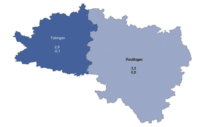 Die Arbeitslosenquote von 3,1 Prozent im Bereich der Arbeitsagentur Reutlingen teilt sich auf in 2,9 Prozent im Kreis Tübingen und 3,3 Prozent im Kreis Reutlingen. Die untere Zahl weist die Veränderung gegenüber dem Januar aus. GRAFIK: AA