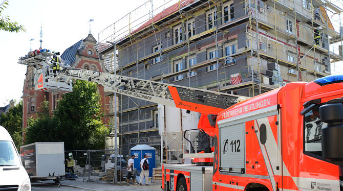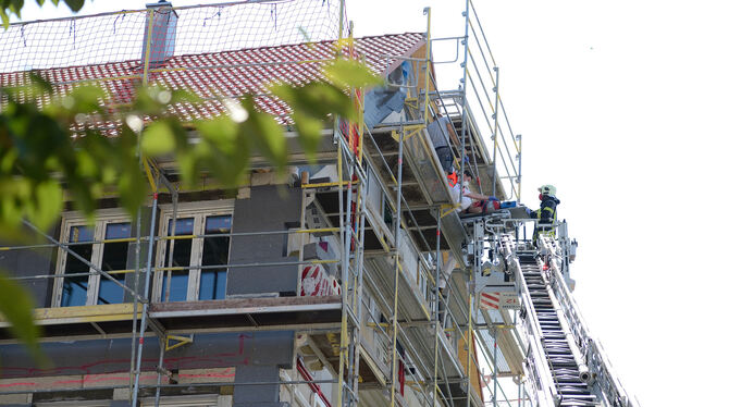 Der Mann war laut Reitter ansprechbar, musste aber schonend nach unten transportiert werden. Das war jedoch nicht ganz einfach. Das Haus befindet sich derzeit im Rohbauzustand, eine Treppe zwischen drittem Obergeschoss und Dachgeschoss fehlte. Deshalb musste die Feuerwehr den Verletzten über ein Fenster auf das Außengerüst bringen und von dort mit einer Drehleiter nach unten. Dort wurde der Mann medizinisch versorgt und ins Krankenhaus gebracht.